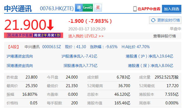3月17日上午消息,中兴通讯跌超8%,创三个月新低。截至发稿,跌7.98%,报21.9港元,市值165.46亿港元。