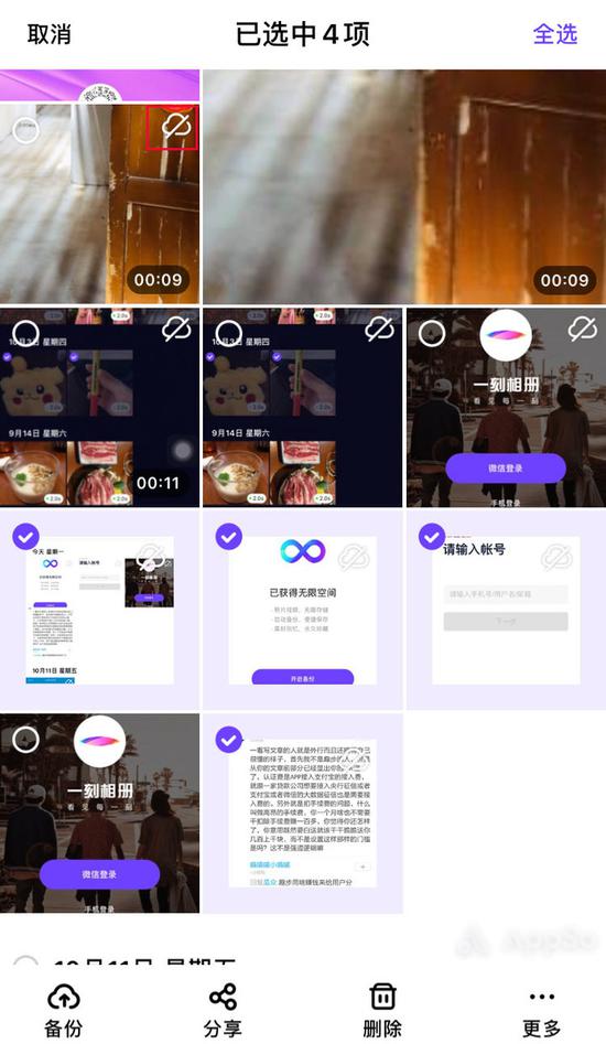 一刻相册对本地和云端图片并未作明显区分,仅用右上角的‘云朵’图标简单标记本地图片,用户无法分开浏览云端相册和本地相册,这就导致在全选的时候,不管是本地还是云端的文件都会被选中。而尽管一刻相册支持照片多选,但只能一张一张地点选,无法像系统自带相册一样滑动快速选中。