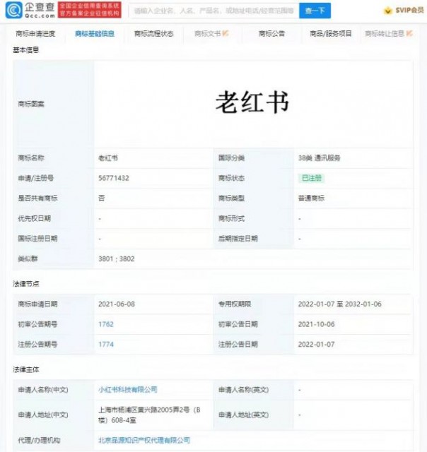 企查查App显示,近日,小红书科技有限公司申请注册的“老红书”商标成功注册,商标国际分类涉通讯服务,注册公告日期为2022年1月7日。