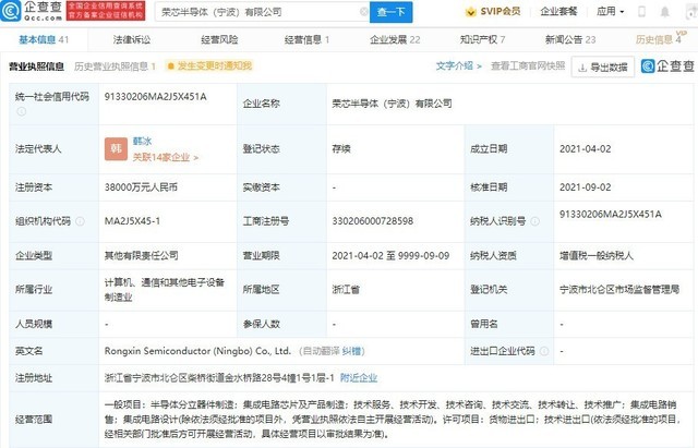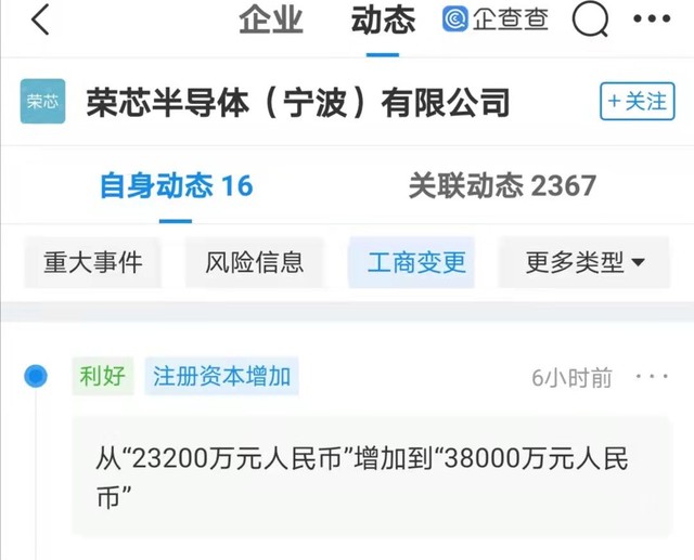 荣芯半导体(宁波)有限公司发生工商变更,新增美团关联公司深圳龙珠股权投资基金合伙企业(有限合伙)、北京酷讯科技有限公司等为股东,公司注册资本由 2.32 亿元人民币增加至 3.8 亿元人民币。