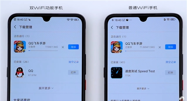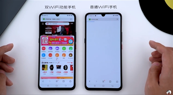 根据戈蓝V公布的对比视频,在双Wi-Fi加持下iQOO下载速度、网页加载速度以及游戏运行相比单Wi-Fi更快。