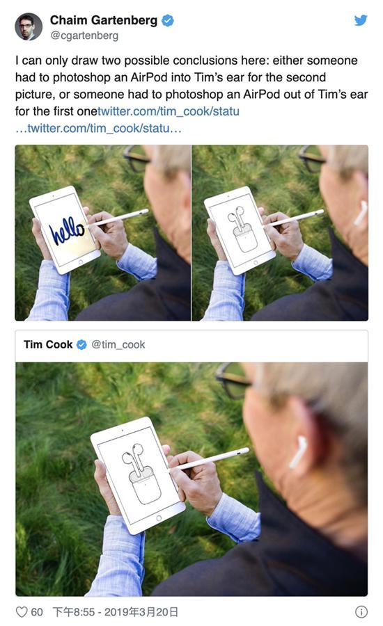 当然这并非库克第一次P图,此前库克曾分享了一张自己佩戴AirPods使用iPad mini的照片,但也被人翻出原图,发现这个AirPods也是P上去的。
